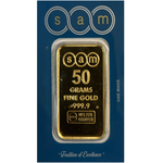 mngm offers 50g minted SAM gold bars with 999.9 purity. Each bar comes with its own unique serial number, as well as a numbered certificate. You have the choice of having it delivered to you, or storing it securely in our vault, which is fully covered by insurance.