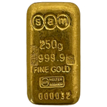 mngm offers 250g cast SAM gold bars with 999.9 purity. Each bar comes with its own unique serial number. You have the choice of having it delivered to you, or storing it securely in our vault, which is fully covered by insurance.