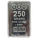 mngm offers 250g SAM silver bar 999 purity. Each bar comes with its own unique serial number, as well as a numbered certificate. You have the choice of having it delivered to you, or storing it securely in our vault, which is fully covered by insurance.